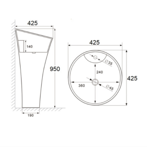 ขนาด 425 x 425 x 950 mm แถมอุปกรณ์น๊อตยึดอ่าง
